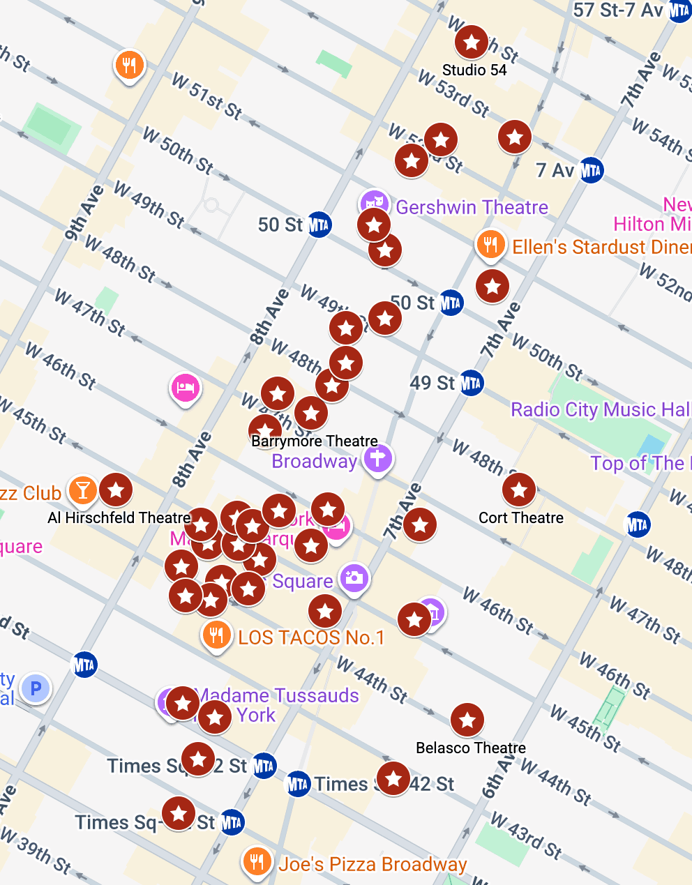 Broadway is shorthand for the Broadway theater district, an area in New York City's Manhattan borough that occupies a segment of Broadway, a 13-mile road. Although the Broadway theater district has a relatively small geographic footprint, its 41 theaters stage some of the world's most popular productions of plays and musicals.
